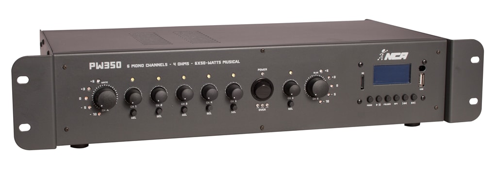Conjunto de 06 amplificadores mono de 30W RMS cada. Dual Zone com volume MASTER independente (IN A e IN B), VU ou até 06 entradas mono com volumes individuais. Chaves de seleção individuais com indicação luminosa e saídas independentes. Permite a utilização com o setorizador de canais ST100.