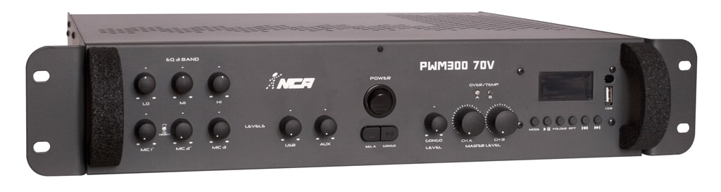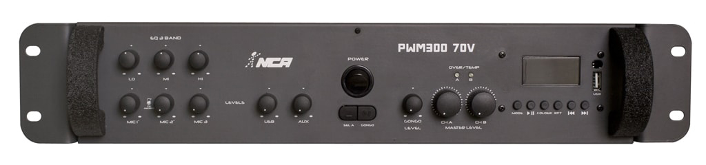 Amplificador para sonorização ambiente, podendo trabalhar em 4 Ohms (200 + 200W RMS) ou 70 Volts (300W RMS - 50 Ohms). GONGO (Ding-Dong) (C.V.I.)*