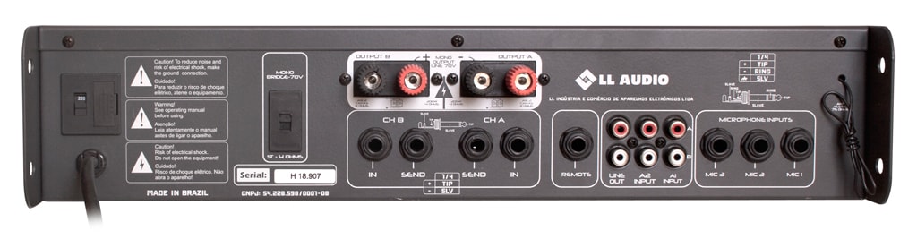 1 Saída 70V quando OUTPUT A e OUTPUT B são ligadas em BRIDGE *(caixas com Trafo de linha 70V) respeitando potência máxima e perdas com cabos.