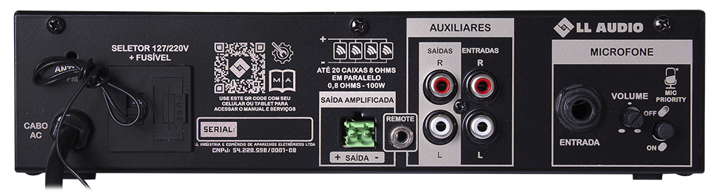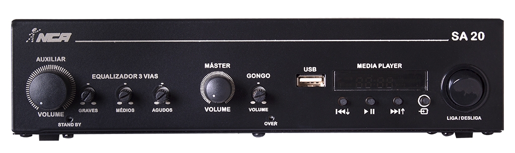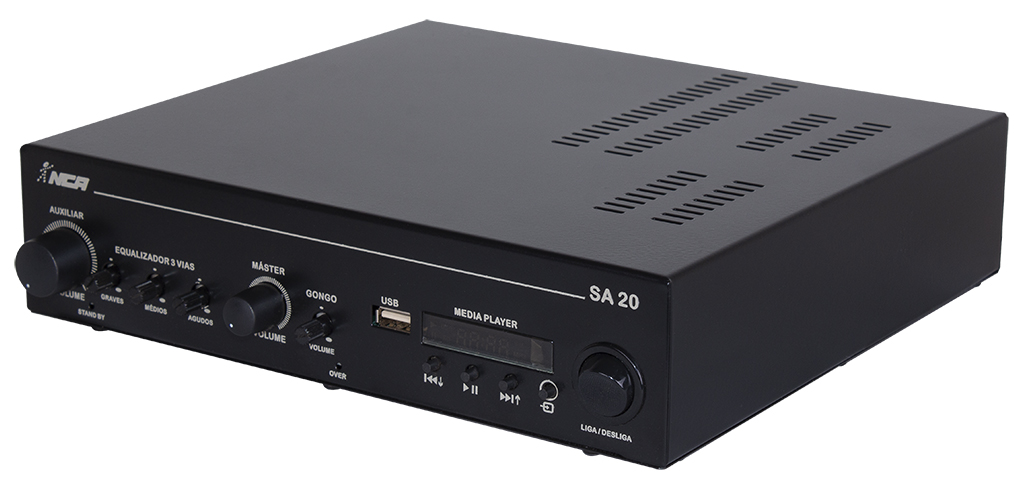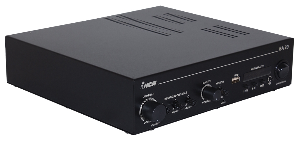 O SA 20 é um amplificador compacto de 100W RMS com volume máster, que permite a ligação direta de até 20 caixas de 8Ω em paralelo. Com amplificação Classe AB, entrega som limpo e agradável para sonorização de diversos ambientes, como academias, bares, empresas, áreas de lazer, clínicas, espaços gourmet e outros.