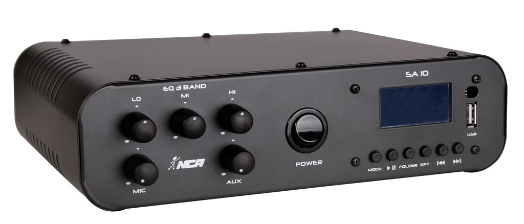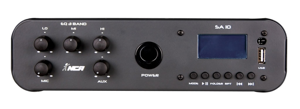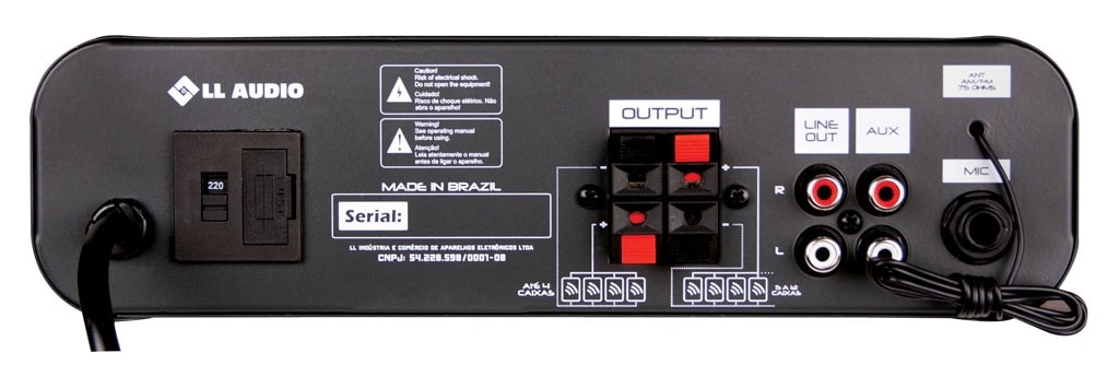 Amplificador Compacto, pode-se ligar até 12 caixas de 8 Ohms em paralelo.