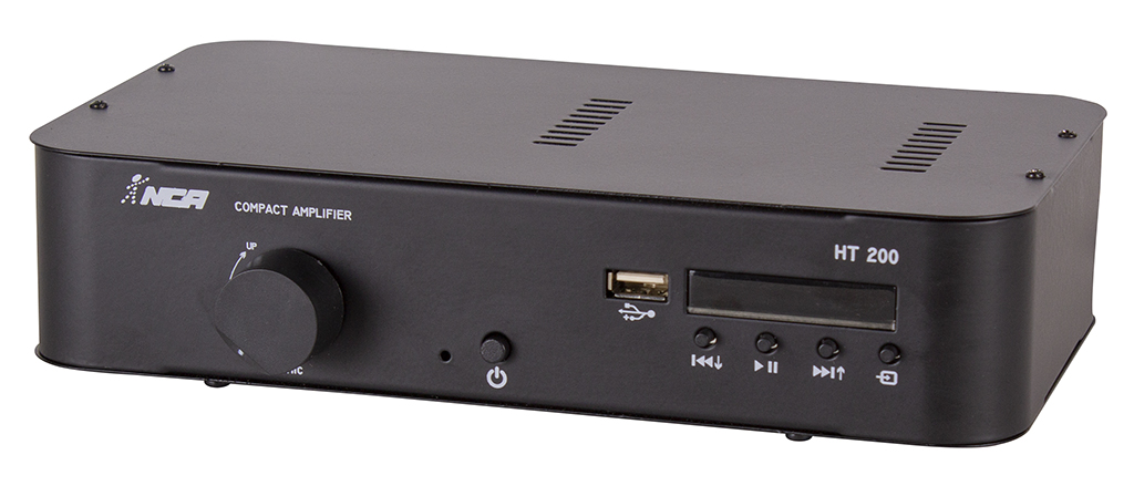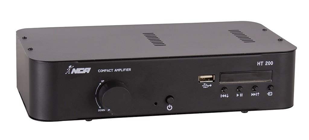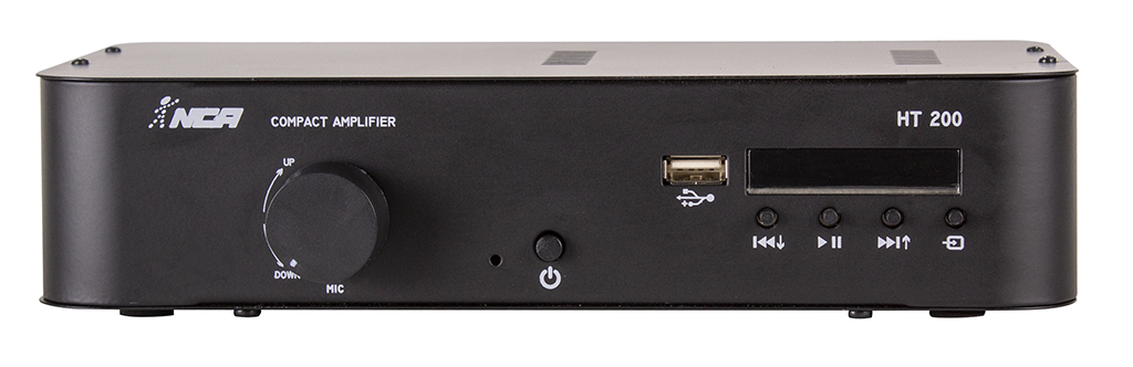 Amplificador Compacto, com entrada auxiliar, entrada de microfone, entrada USB e FM, e demais funções descritas acima.