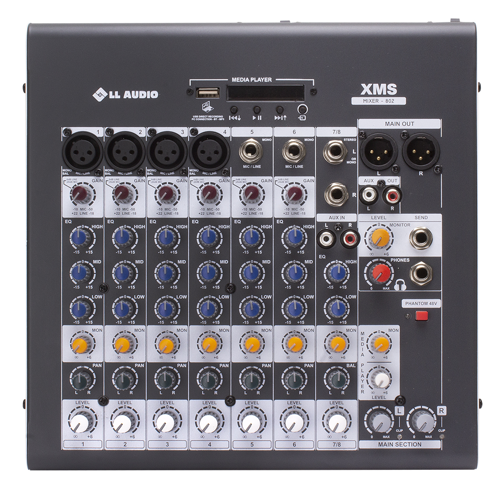 Novas Mesas Premium da Linha XMS. Alimentação Phantom Power, pré-amplificadores de microfone com Ganho e Equalização de 3 vias, saída de Monitor com volume independente por canal, Fones de Ouvido e Master. Media Player, que permite a transmissão ao vivo de todo conteúdo de áudio para o computador via USB ou gravação em Pendrive, conexão compatível com Bluetooth, Rádio FM, Reprodutor Mp3, com volume independente e Controle Remoto.