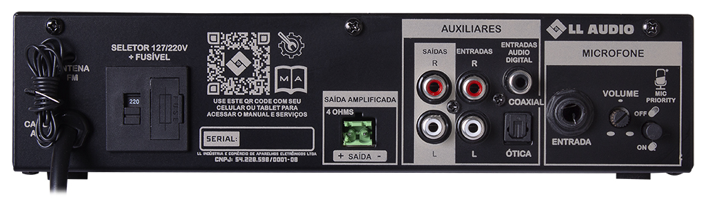 Oferece ampla conectividade: entrada de microfone P10 com volume independente e função Mic Priority, entradas auxiliar RCA (L/R), digitais óptica e coaxial, ideais para Smart TVs, com chave de seleção DIGITAL/AUX. Conta com Módulo Media Player integrado, com entrada USB, Bluetooth, rádio FM, equalizações pré-programadas e controle remoto com standby, seleção de entradas e demais comandos do player. Além disso, traz controle remoto grande e displays de LED de alta durabilidade. Para completar, possui equalizador de 3 bandas e saída auxiliar para enviar o áudio a outros equipamentos, inclusive subwoofer.