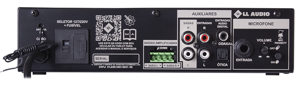 Oferece ampla conectividade: entrada de microfone P10 com volume independente e função Mic Priority, entradas auxiliar RCA (L/R), digitais óptica e coaxial, ideais para Smart TVs, com chave de seleção DIGITAL/AUX. Conta com Módulo Media Player integrado, com entrada USB, Bluetooth, rádio FM, equalizações pré-programadas e controle remoto com standby, seleção de entradas e demais comandos do player. Traz ainda controle remoto grande e displays de LED de alta durabilidade. Para completar, possui equalizador de 3 vias e saída auxiliar para envio de áudio a outros equipamentos, inclusive subwoofer.
