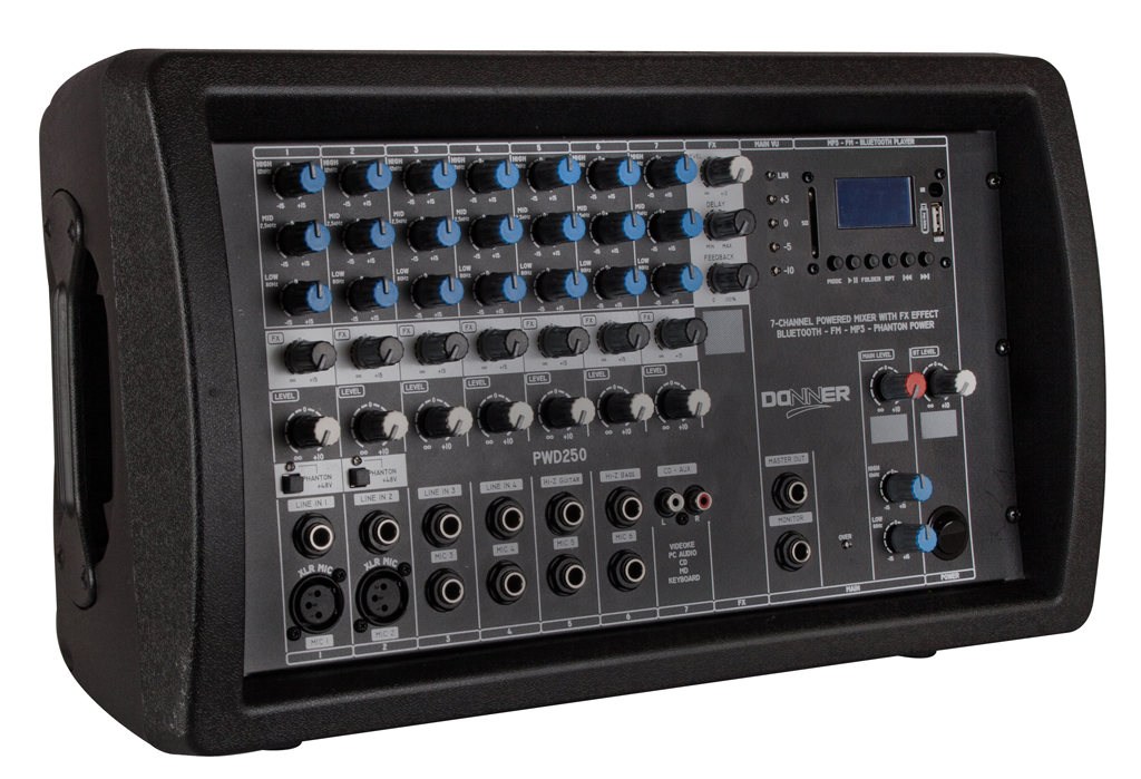Mixer Amplificado de 250W RMS (Double Amplifier) de 07 canais, entrada USB com Change Folder, rádio FM, efeito interno, compatível com a tecnologia bluetooth, Phantom Power 48V e Bargraph.