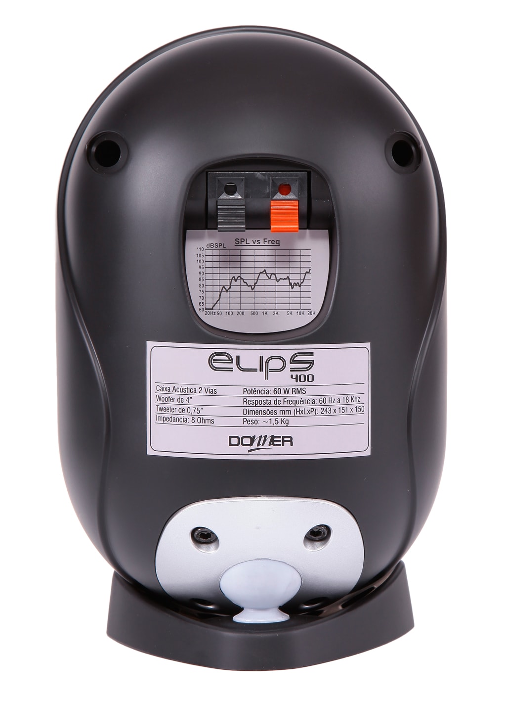 • 2 Vias: Woofer de 4” Tweeter de 0,75” • Impedância: 8 Ohms • Potência: 60 W RMS • Resposta de Frequência: 60 Hz - 28 Khz • Dimensões (mm): (H)243 x (L)151 x (P)150 • Peso (par): ~3 Kg