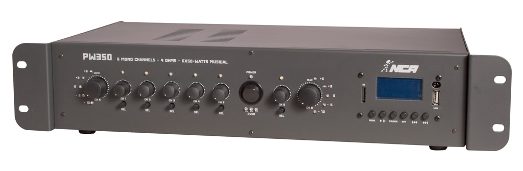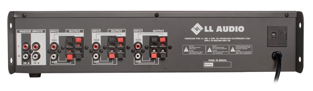Conjunto de 06 amplificadores mono de 30W RMS cada. Dual Zone com volume MASTER independente (IN A e IN B), VU ou até 06 entradas mono com volumes individuais. Chaves de seleção individuais com indicação luminosa e saídas independentes. Permite a utilização com o setorizador de canais ST100.