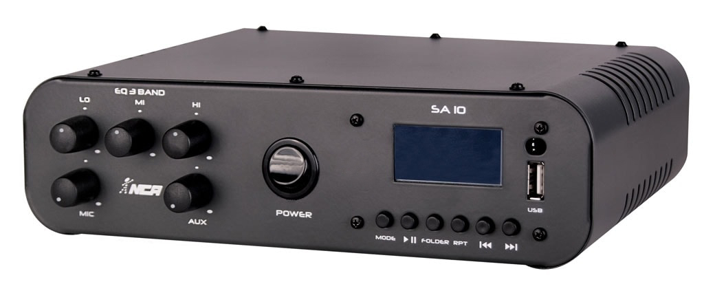 Amplificador Compacto, pode-se ligar até 12 caixas de 8 Ohms em paralelo.