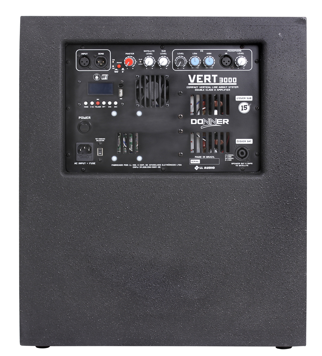 Line Array Vertical – Sistema de 750W RMS composto por Subwoofer de 15” Bass Reflex e Satélite com 2 falantes de 6” + Drive Titanium. Controles de volumes Independentes para o subwoofer, para o satélite e para as entradas de microfone e USB. Com excelente pressão sonora (SPL) e qualidade vocal única o Vert 3000 é a solução perfeita para apresentações ao vivo, DJs, igrejas, eventos corporativos, etc. Acompanha cabo e suporte.