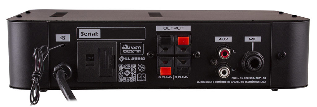 Amplificador Compacto, com entrada auxiliar, entrada de microfone, entrada USB e FM, e demais funções descritas acima.