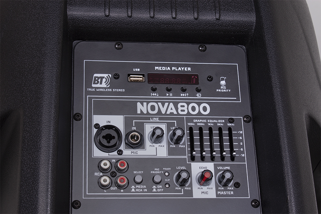 A NOVA 800 conta com equalizador de 5 vias e efeito ECHO com controle de nível, permitindo ajustar o som de acordo com o ambiente e o estilo da apresentação.