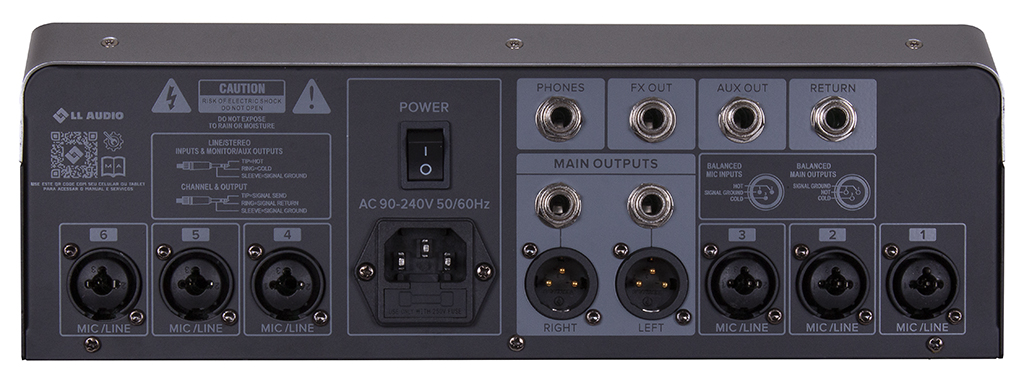 • 6 canais de entrada de microfone e linha com ganho e conector COMBO e LED de Pico