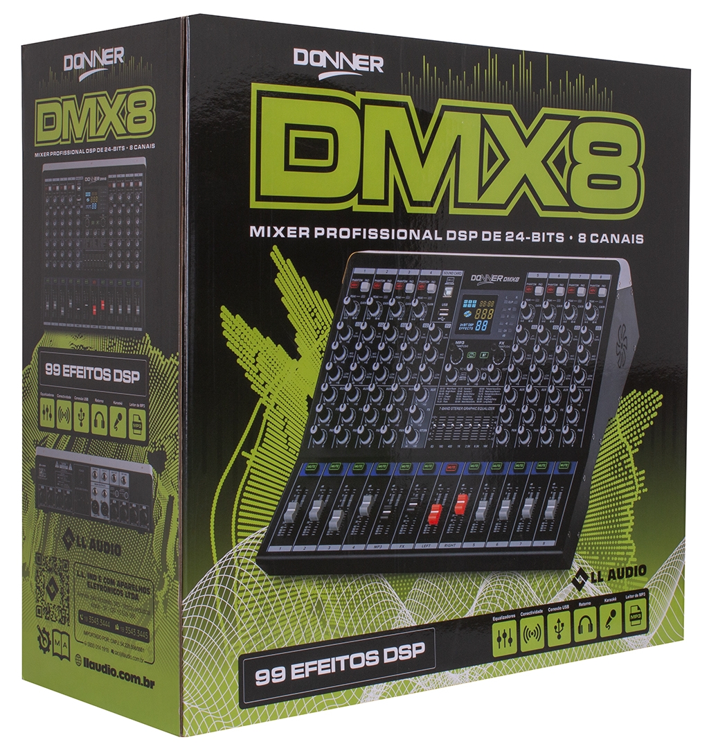 Feita para quem leva o som a sério, ela entrega clareza, fidelidade e total controle em qualquer ambiente. Com interface OTG, efeitos DSP (Processamento digital de Sinais), equalizador de 7 bandas e display colorido, a DMX8 transforma sua experiência de mixagem. Possui Bluetooth e gravação integrada, ideal para músicos, técnicos de som e produtores que querem tudo em um só equipamento.