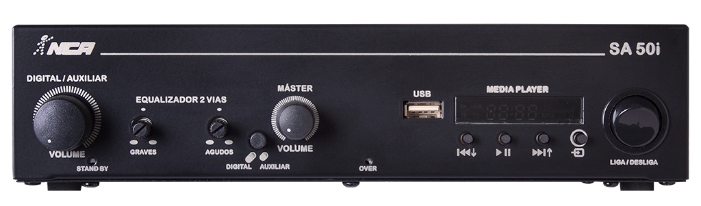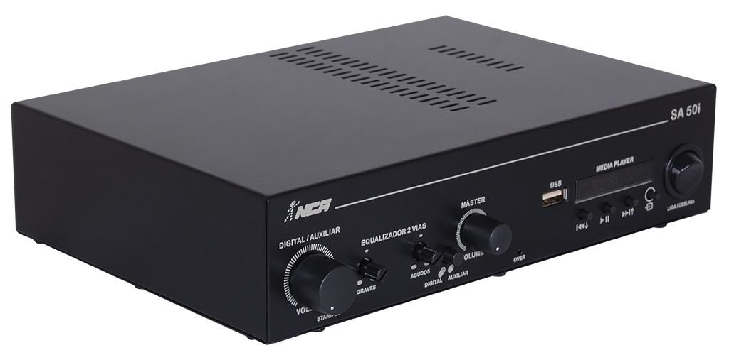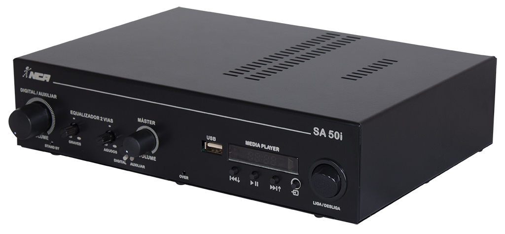 O SA 50i é um amplificador de 50W RMS em 4Ω, com volume máster, que permite a ligação direta de 2 caixas de 8Ω ou de até 8 caixas em série/paralelo. Projetado com amplificação Classe AB, entrega som limpo e consistente para sonorização de ambientes como academias, bares, empresas, áreas de lazer, clínicas, espaços gourmet e outros.