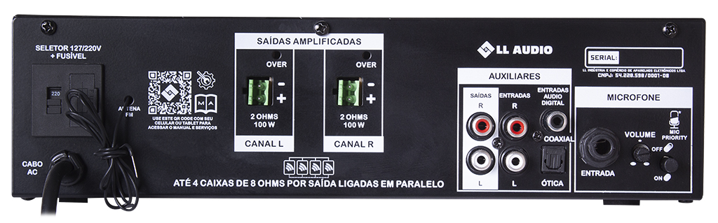 Permite a ligação direta de até 4 caixas de 8 Ω por canal, ou até 16 caixas em série/paralelo por canal.