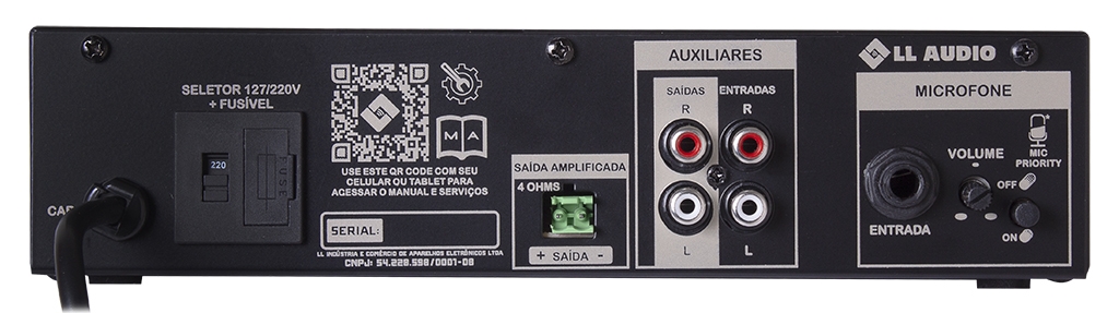 Possui equalizador de 3 vias e oferece entrada de microfone P10 com volume independente e função Mic Priority, além de entrada auxiliar RCA (L/R) com volume independente.