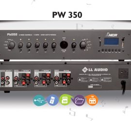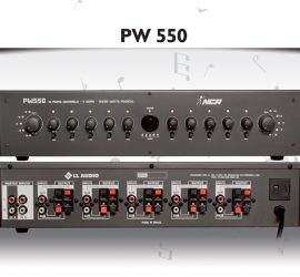 PW550 – Conjunto de 10 amplificadores mono de 30W RMS cada. Dual Zone com volume MASTER independente (IN A e IN B), VU ou até 10 entradas mono com volumes individuais. Chaves de seleção individuais com indicação luminosa e saídas independentes. Permite a utilização com o setorizador de canais ST100.